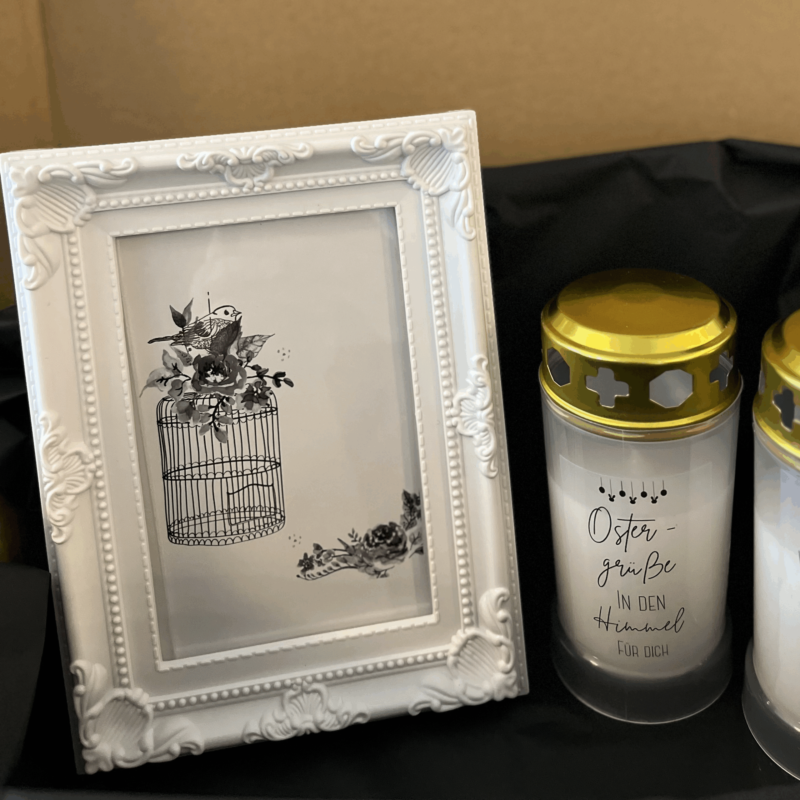 Mit einem Bilderrahmen für ein Lieblingsfoto, einer handgefertigten Zeichnung (Foto oder Pfotenabdruck), einem Kerzen-Glas sowie kleinen Impulsen zu Ritualen begleitet diese Box durch die Trauer um Fellfreunde und Samtpfoten.