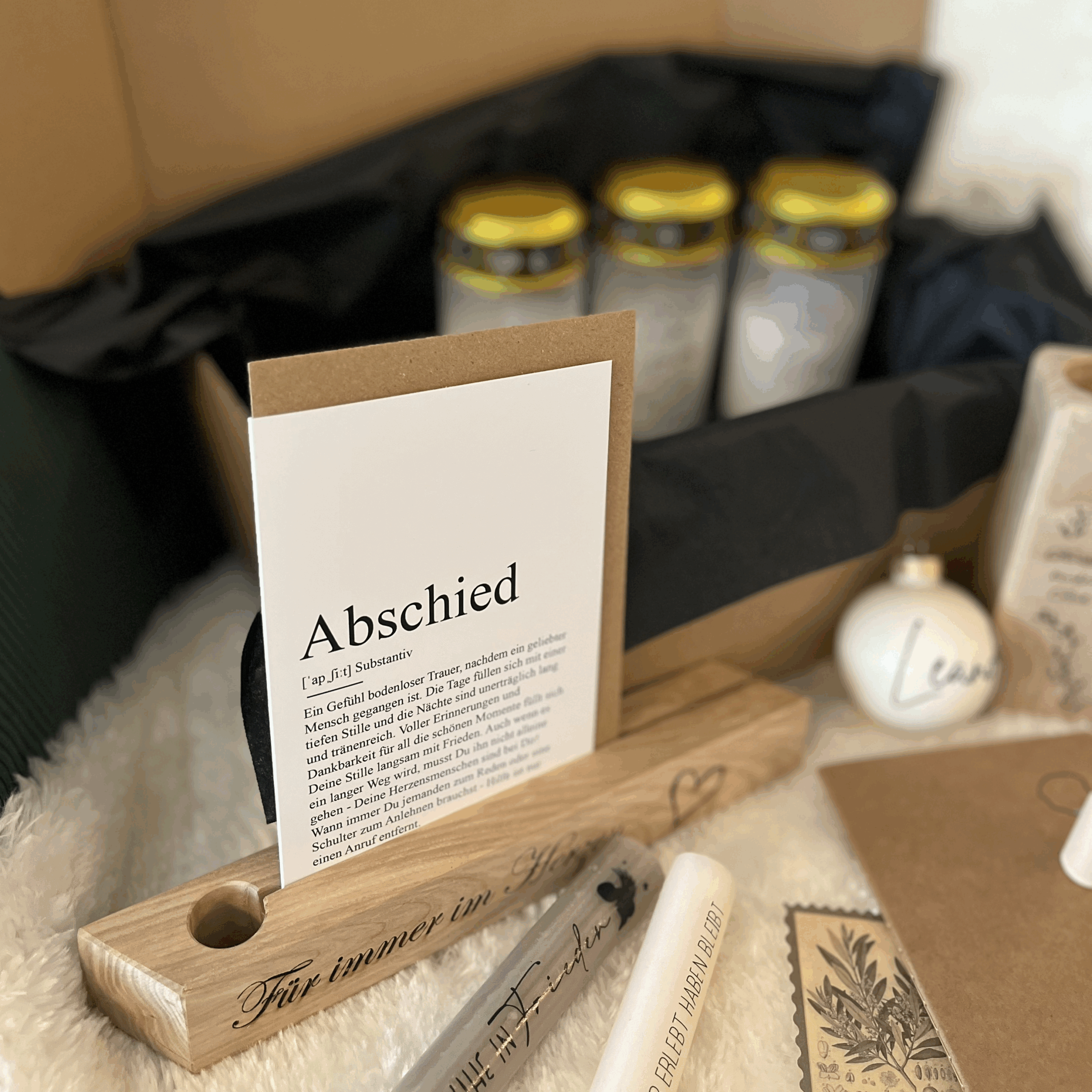 Diese einfühlsame Klappkarte mit der Aufschrift ‚Abschied‘ bieten Ihnen eine liebevolle Möglichkeit, Anteilnahme auszudrücken und Trost zu spenden.